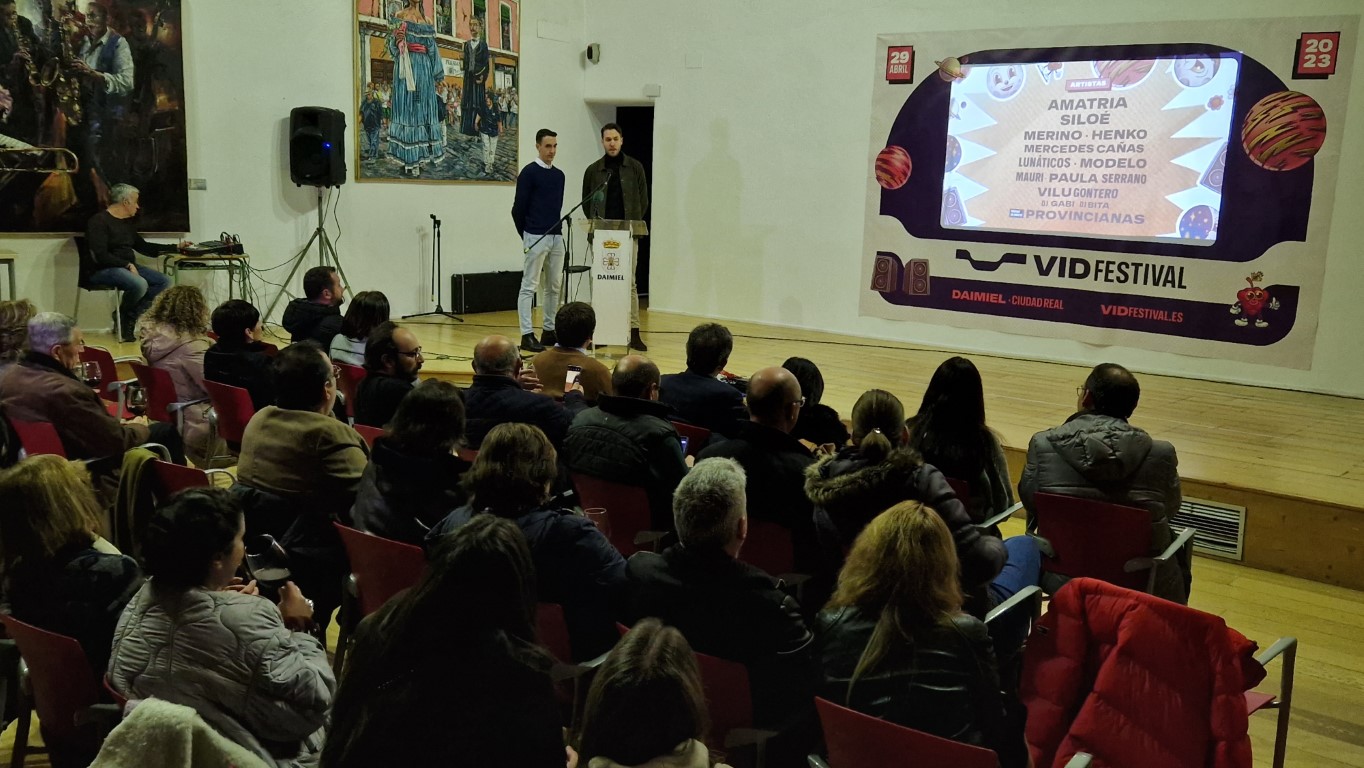 El Museo Comarcal de Daimiel acogió este jueves la presentación de Vid Festival, propuesta encabezada por los daimieleños Mario García-Muñoz Sánchez-Camacho y Pedro Díaz-Pinés Villegas. La apuesta por el talento musical local y regional, y su maridaje con el vino y la gastronomía manchega son las principales señas de identidad de este nuevo festival que se celebrará el 29 de abril de 2023 en el Auditorio Municipal y Recinto Ferial de Daimiel.